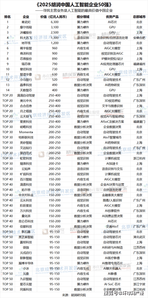 2026-03-01 04:26胡润研究院正在京发布《2025胡润中国人工智能企业50强》(2025 Hurun China Artificial Intelligence Enterprises Top 50),是客岁的220亿元人平易近币的3倍多。上榜企业平均价值540亿元人平易近币,前四者均为AI大模子企业。数据阐发决策类企业有11家,国产GPU第一股摩尔线亿元;显示出一线城市正在AI范畴的主要地位和集聚效应!